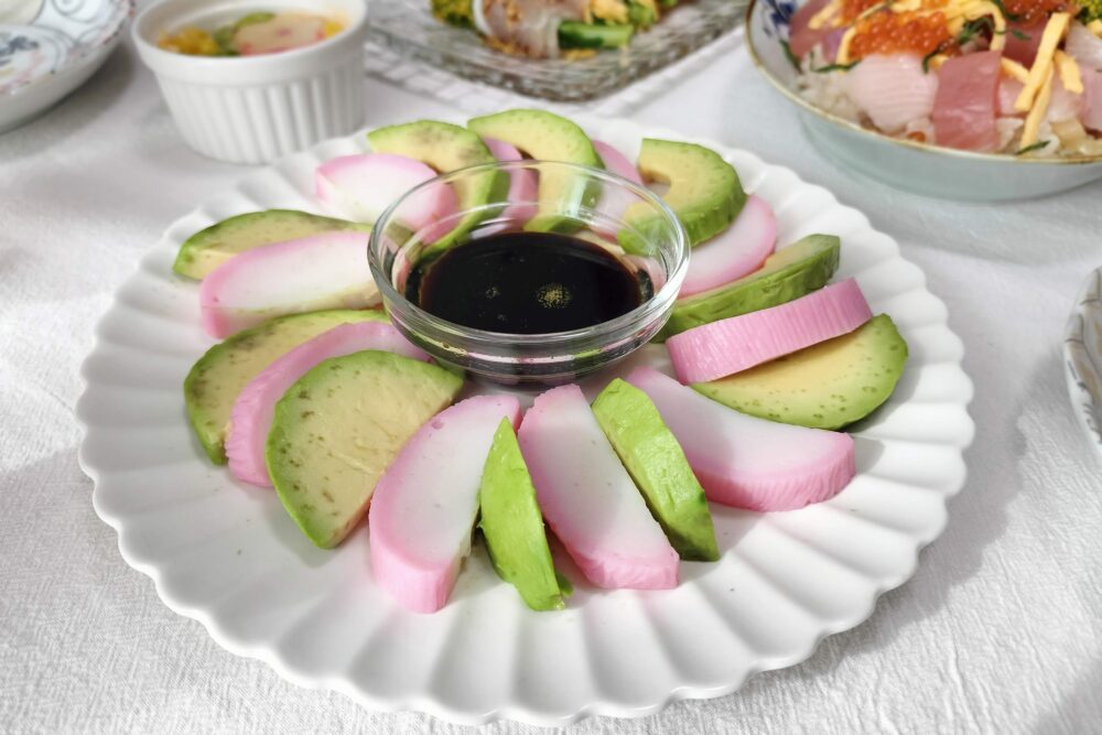 - かまぼことアボカドをスライスして、レモン汁があればアボカドに少量まぶして変色止めをします。かまぼことアボカドをお皿に交互に並べます。