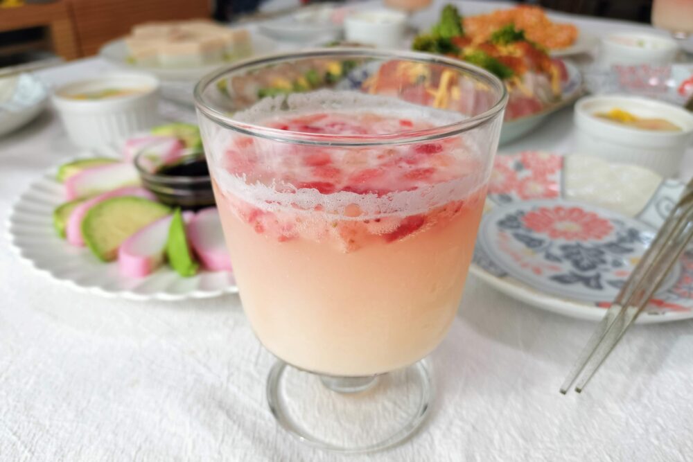 ひな祭りといえば白酒ですが、より手軽に?カルピスです。冷凍いちごダイスを加えただけの簡単アレンジです。