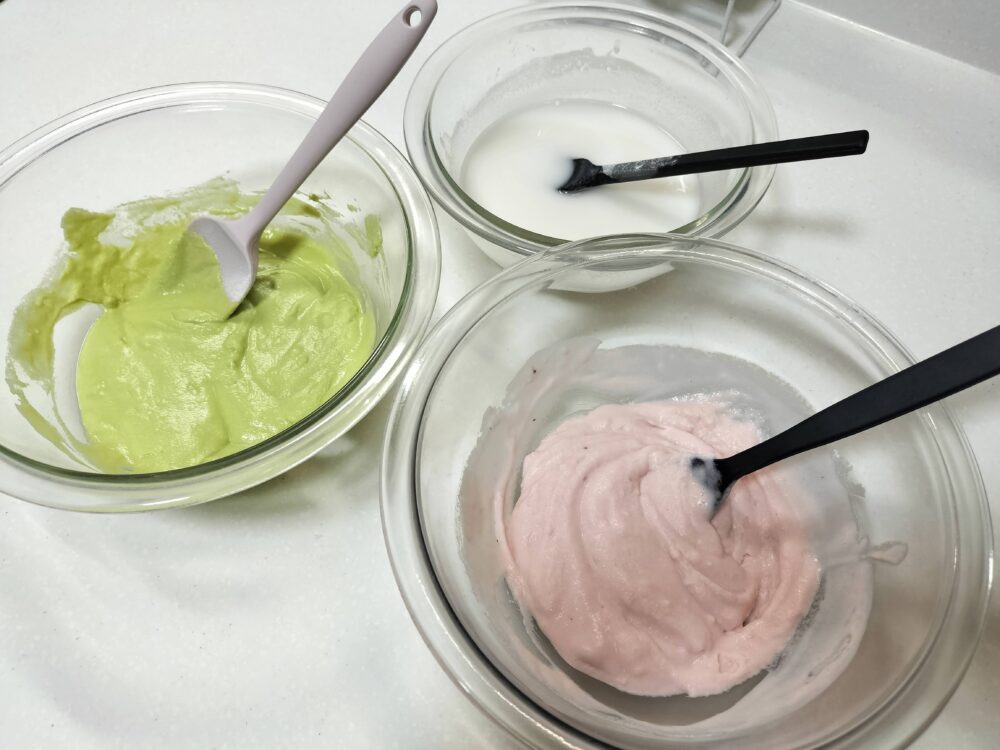 - ピンク生地、黄緑生地:アイス(いちご、抹茶)を、それぞれ別の耐熱ボウルに入れて、600Wのレンジで30秒~加熱して混ぜ、水大さじ2をそれぞれ加えてよく混ぜます。