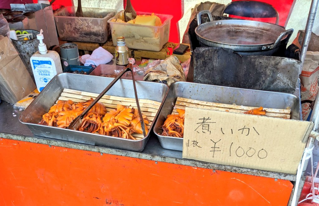 焼いかではなく「煮イカ」は、茨城や栃木・群馬の一部地域で親しまれている、お祭り屋台フードです。乾物のスルメを水で戻して煮込み、食紅で色付けされています。もともと海から遠い内陸地域では新鮮な魚介が手に入りにくく、保存のきく干物が重宝されていたそう。