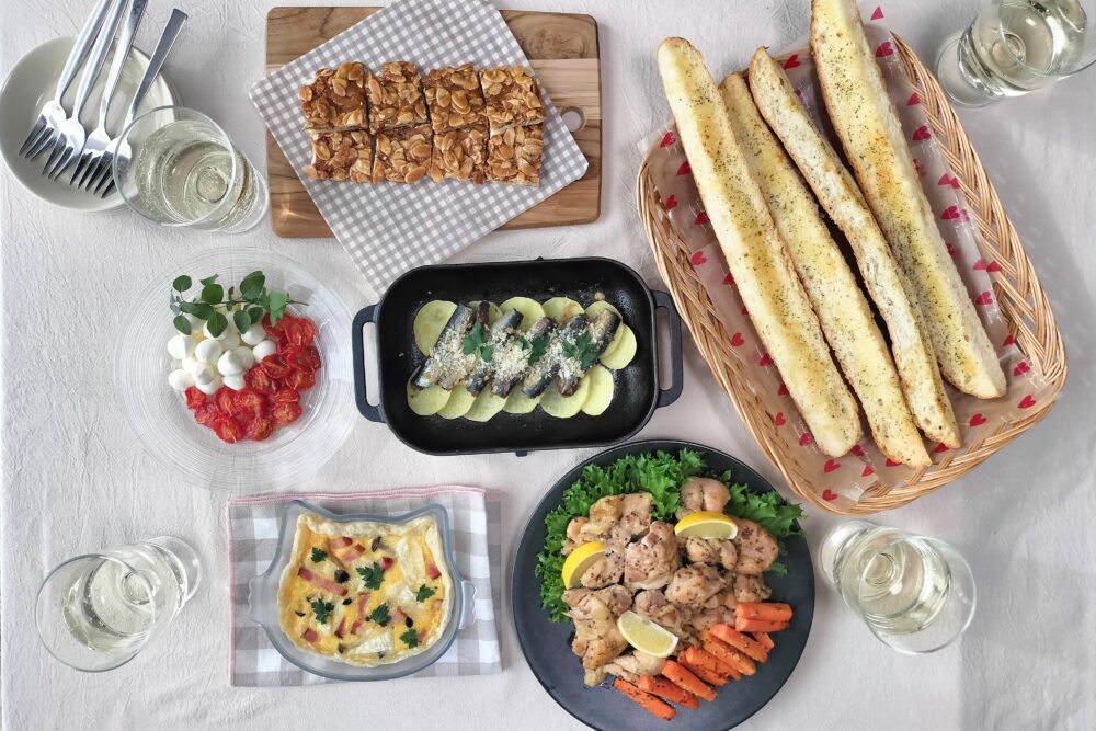 6品全てオーブンを使って調理しました。オーブンの天板でしかできない長いガーリックトーストや、オーブンで焼いたトマトを使ったカプレーゼなど、オーブンならではのメニューもあります。ずっと見ていなくてもほったらかしでOKで、コンロを使わず洗い物も少ない、頑張らないパーティー料理です。本番を思いっきり楽しみましょう!