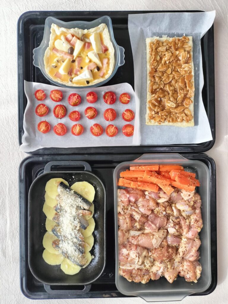 メニューごとに紹介しましたが、オーブンで同時調理できるのが、①200℃で10~15分、②200℃で25分 の2回に分けてオーブンで焼いています。