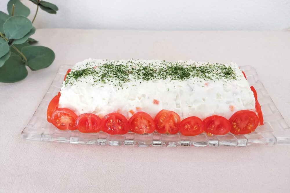 - ラップをして冷蔵庫で冷やし、お皿に出してスライスしたミニトマトを周りに飾り、粉パセリをかけたら完成。