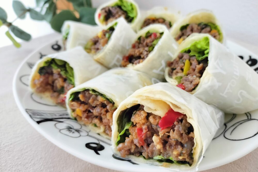 - トルティーヤの上にレタス、プルコギを乗せ、マヨネーズをかけ、両端を折りたたんで手前から巻きます。ワックスペーパーで包んでマステで止めます。