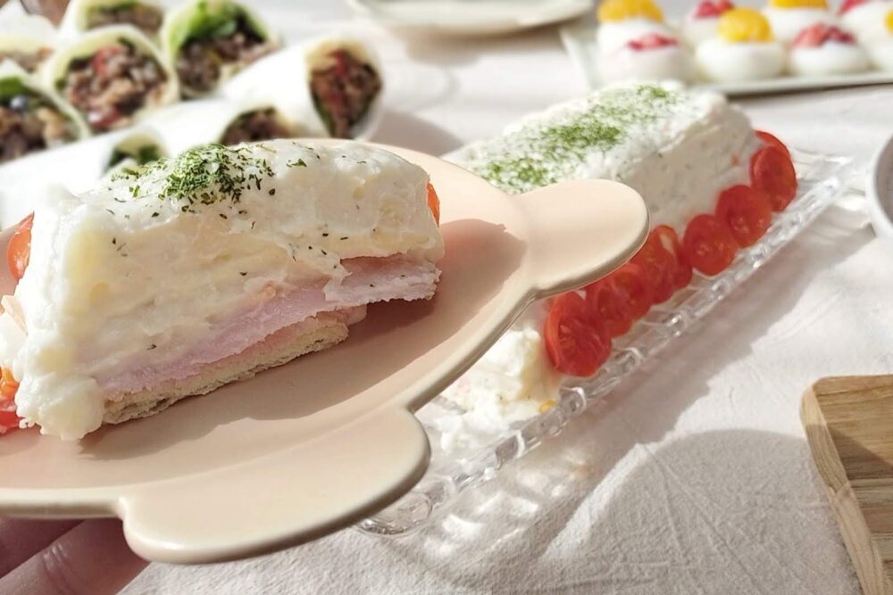 業スーの大容量ポテトサラダ(1kg)を使って、重ねるだけで豪華に見えるポテサラケーキです。1kgポテサラはたっぷり量があるので、惜しみなく使えます。業スーのポテサラは具材がシンプルなので、アレンジ無限大です。