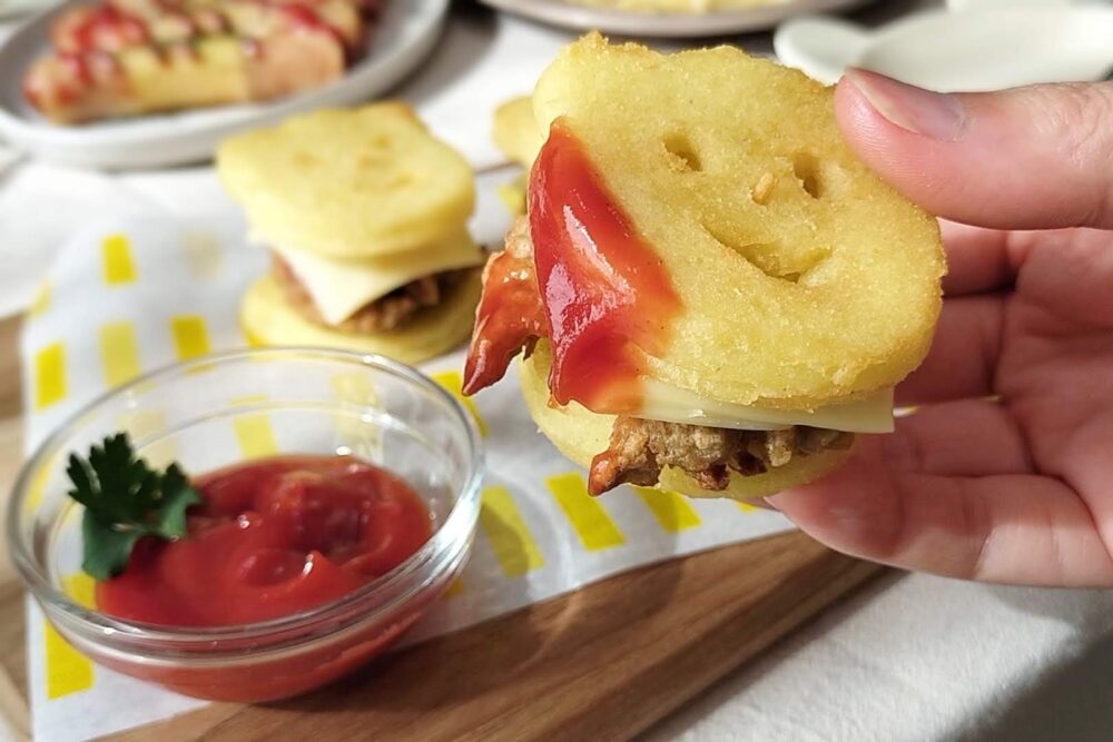 業スーのロングセラー商品、くまさんの顔のポテトをアレンジして、子どもが喜ぶポテトバーガーに!中に挟むミートボールも業スーの激安ミートボールです。ぺったんこにしてカリカリに焼いて、簡易パティにしました。