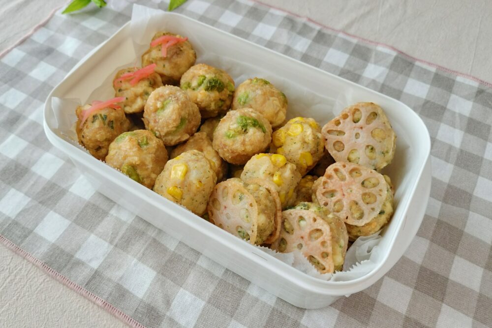ベースの肉だねは全て同じなので最初に作り、4種類の具材で色々味を楽しめるさつま揚げです。お肉だけじゃなくて、野菜も一緒に摂れるおかずにしました。