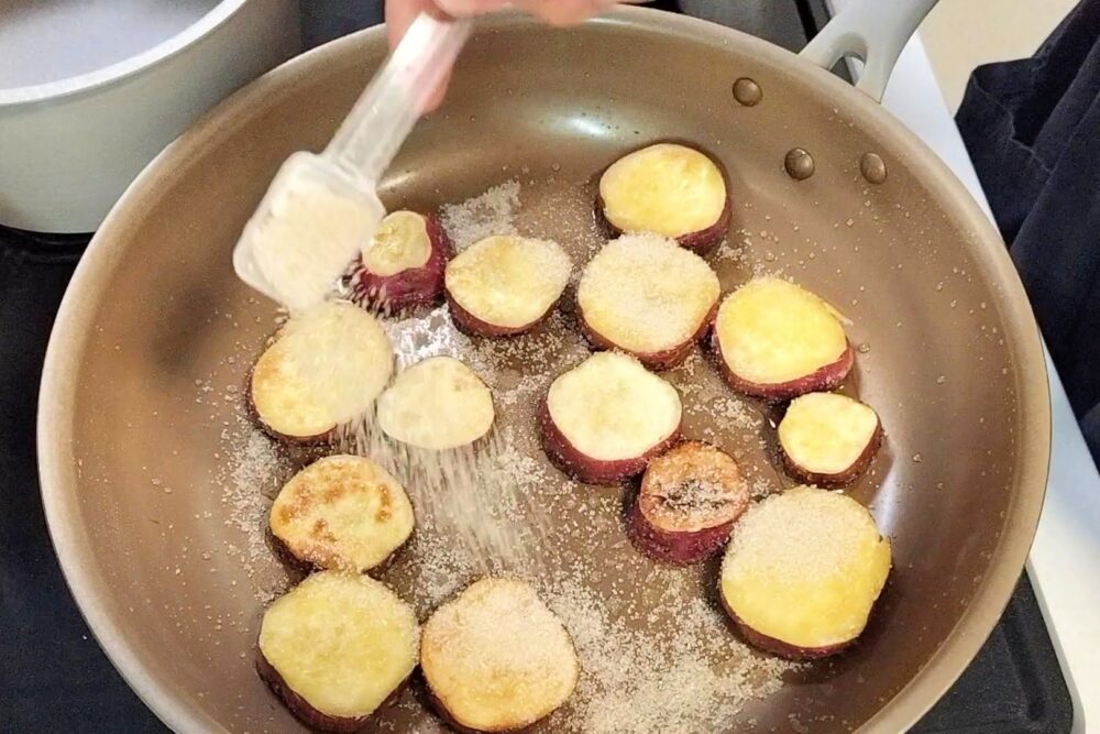2. フライパンにサラダ油を熱し、水けをふき取ったさつまいもを焦げ目がついてカリカリになるまで揚げ焼きします。