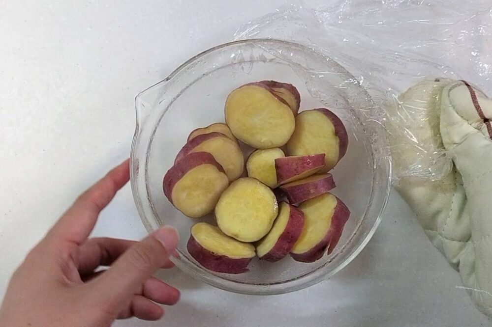 1. さつまいもは皮付きのまま1cmの輪切りにして水にさらします。水けを切り、600Wの電子レンジで3分加熱します。