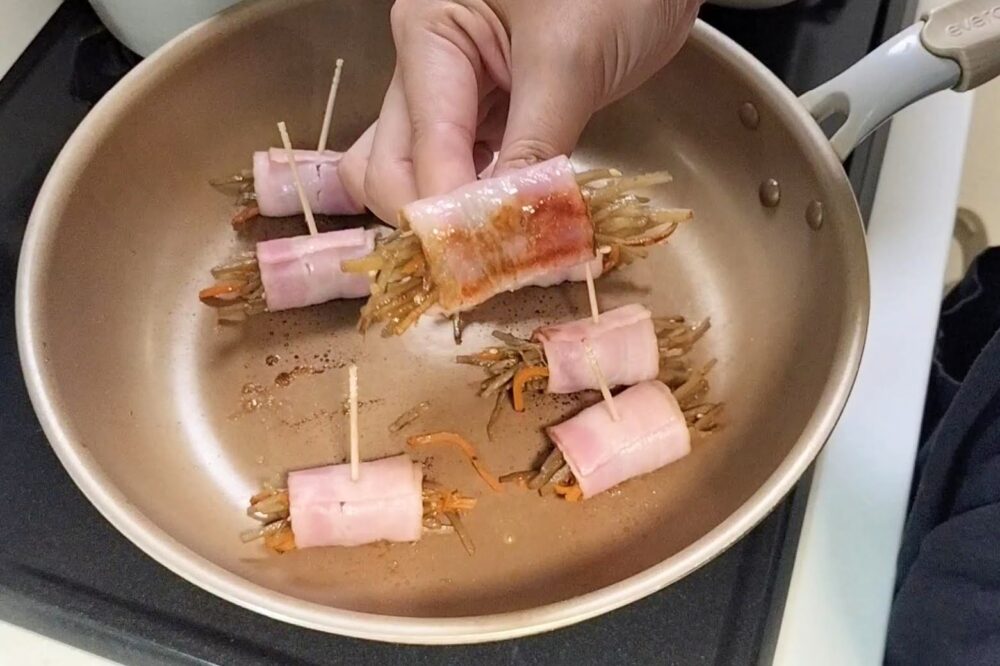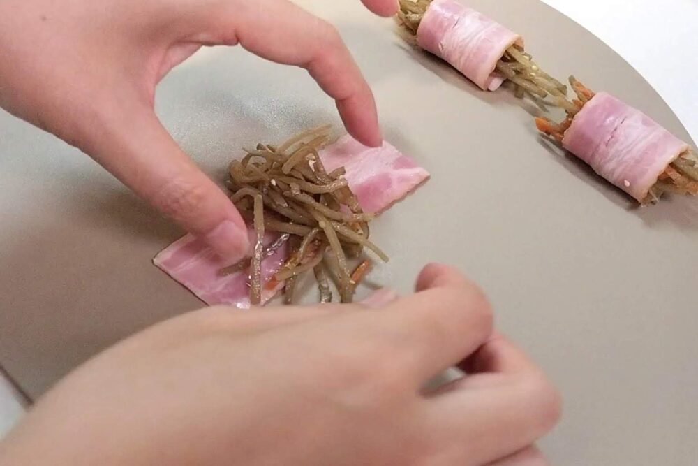 きんぴらをお弁当に入れたいけどバラバラして食べにくいので、ベーコンで巻きました。きんぴらはお惣菜(セブンのパウチ入りの)を使用しました。前日に手作りしても良さそうです。爪楊枝の先にマスキングテープをつけて旗にして、運動会感を出しています。