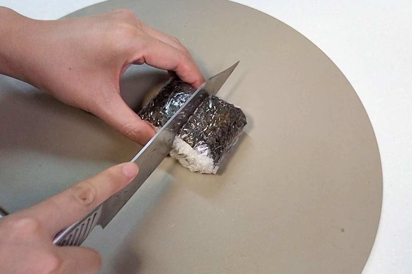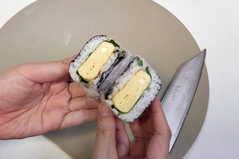 18cm角なので、全型の板海苔と横幅がとぴったり同じなので、今回のように海苔1枚を3等分で作ったおにぎらずもぴったりジャストフィットです。