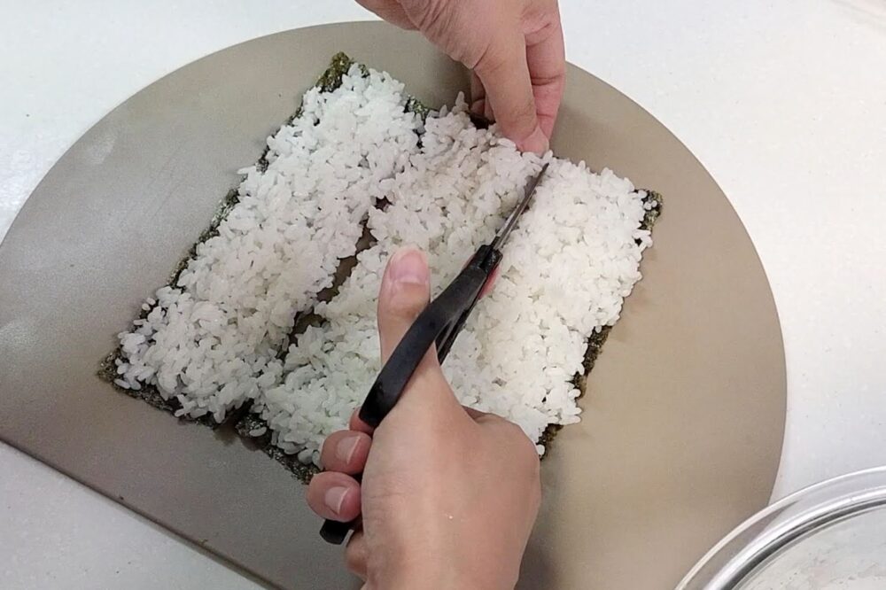 2. ごはんに塩を混ぜておきます。海苔1枚の上にごはん1合分を平らに広げ、ハサミで縦3等分に切ります。海苔2枚分作ります。