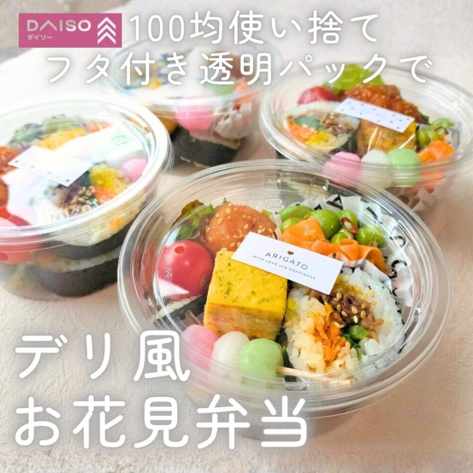 100均のフタ付き透明パックを使ったおしゃれなデリ風お花見弁当を紹介。ダイソーの使い捨て容器に詰めるだけで、カフェのデリのようなお弁当に。おかずはキンパやヤンニョムシュリンプ、春らしいおかずの簡単レシピです。